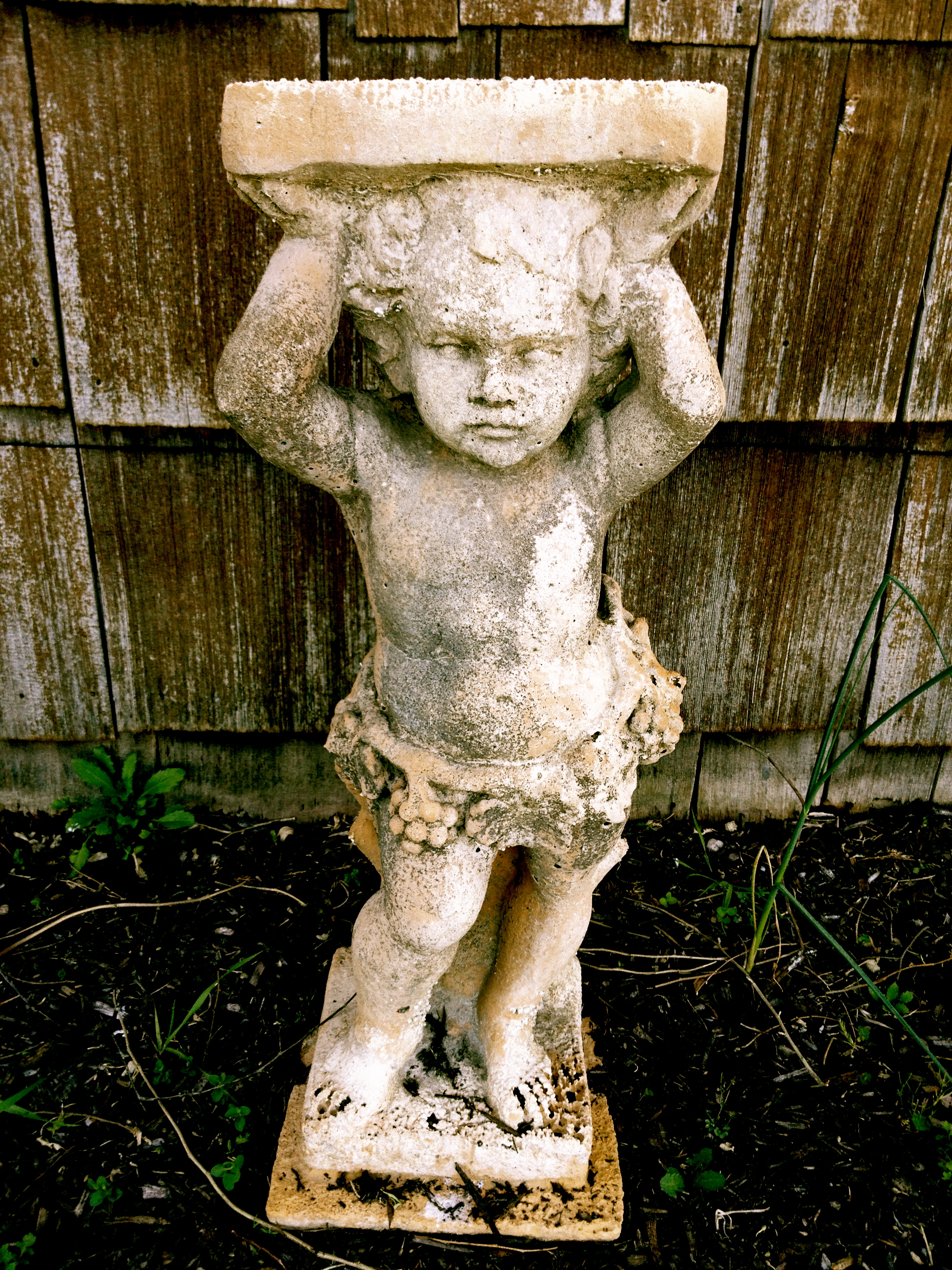 On a quest to find my own equilibrium one day, I took a short walk in my neighborhood, and met up with the Stone Stranger featured in this post. I make the same loop around the corner frequently, yet I have never seen Stone Stranger before. He was standing there quietly, mostly out of view, against the side of a vacant home. Struck by his asymmetrical posture (much like my own) I stopped to look more closely.